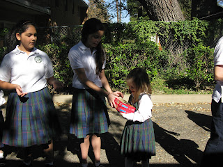 | An awesome tradition at Grace's school -- an assembly line to pass the donated food to the church food pantry! Teaching philanthropy at an early age :) |